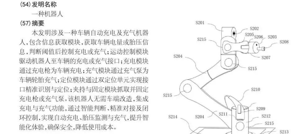 值得关注的是,该专利技术在充电功能基础上实现了创新升级,集成了轮胎充气功能,可在充电过程中同步完成轮胎充气操作,形成“充电+维护”的一体化服务闭环。据了解,该机器人通过视觉+激光雷达双定位单元,实现充电枪与充气泵的精准对接,无需改造车辆即可完成全流程操作,其闭环控制系统可确保操作稳定性,相比人工操作能降低40%以上的人工成本。