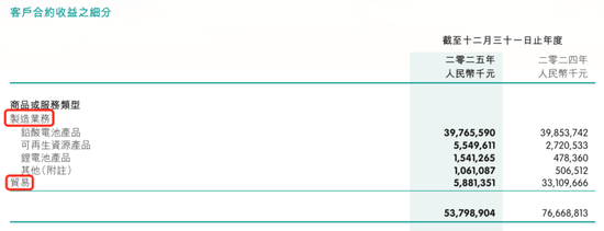 天能动力将业务分为“制造业务”与“贸易业务”两大板块。2024年及以前,天能为了做大规模,曾开展了大规模的原材料贸易。数据显示,2022年至2024年贸易业务收入分别为326.28亿元、364.94亿元、331.1亿元,占营业收入比重也超过了40%。